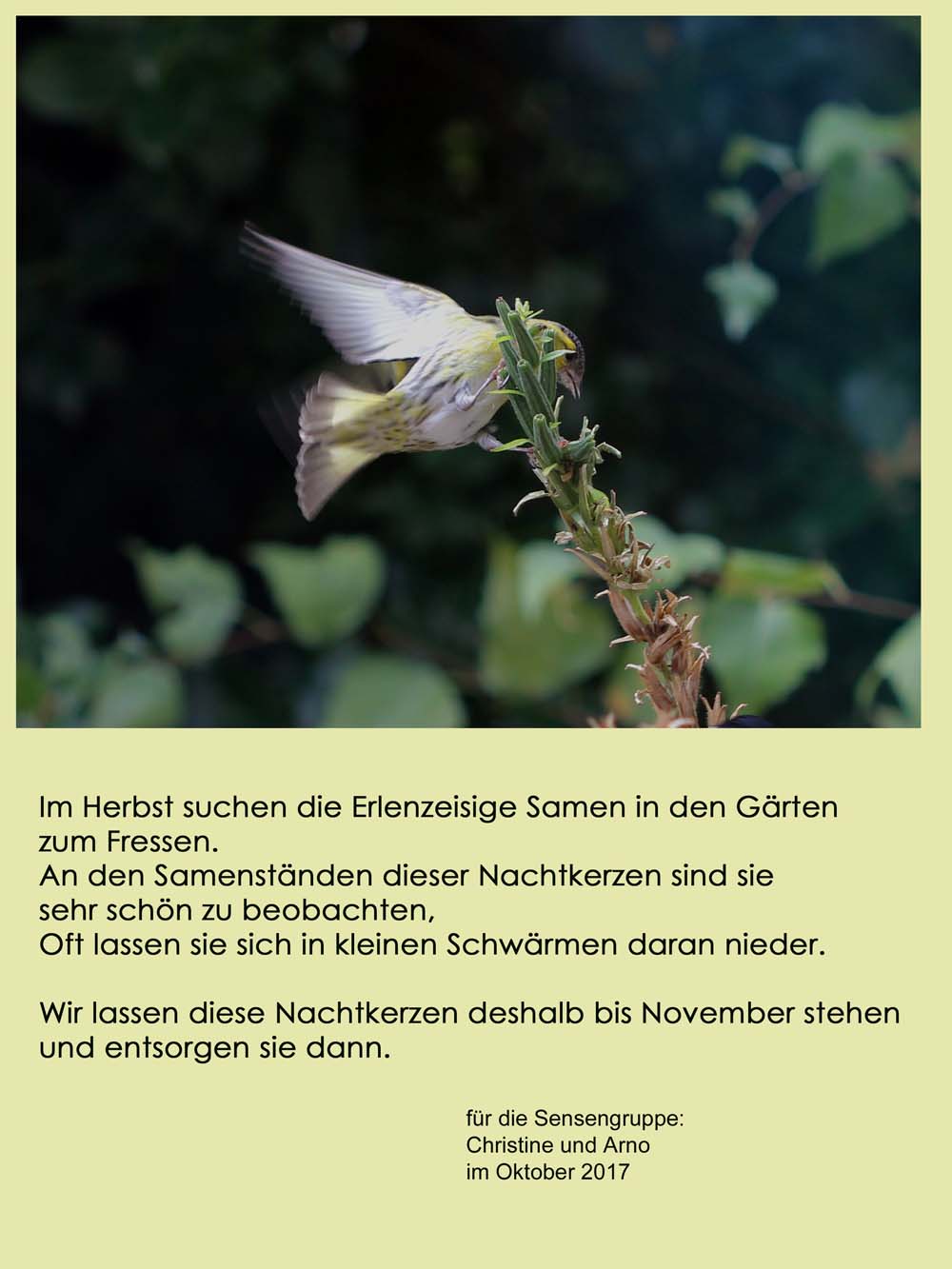 Die Wiese soll kurz in den Winter, so lassen wir nur wenig ausgewählte Pflanzen stehen . . .. . . z.B. diese Gruppe von verblühten Nachtkerzen. Weshalb wir diese stehen lassen, siehst du auf dem kleinen Plakat am Zaun